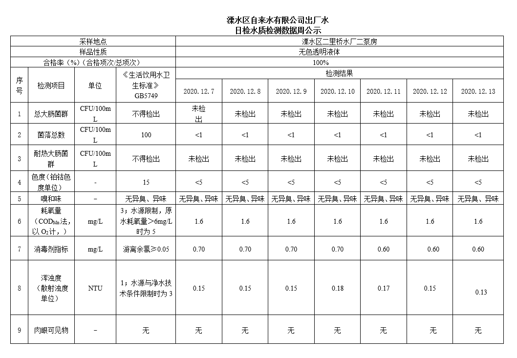 出廠水每周公示2020.12.15 時間:2020-12-15 分類:水質(zhì)公示 上一篇: 出廠水每周公示(2020.12.8) 下一篇: 出廠水每周公示(2020.12.22) 相關(guān)文章 出廠水每周公示2025.12.1-2025.12.7 出廠水每周公示2025.11.24-2025.11.30 出廠水每周公示2025.11.17-2025.11.23 出廠水每周公示2025.11.10-2025.11.16 2025.10.22管網(wǎng)水月度檢測數(shù)據(jù)公示 2025.10.14管網(wǎng)水月度檢測數(shù)據(jù)公示 2025.10.22澤源管網(wǎng)水月度檢測數(shù)據(jù)公示 2025.10.22澤源管網(wǎng)末梢水月度檢測數(shù)據(jù)公示