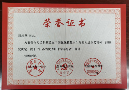 近日,省紅十字會、省文明辦、團(tuán)省委聯(lián)合發(fā)文,表彰2021年12月以來成功實(shí)現(xiàn)造血干細(xì)胞捐獻(xiàn)的同志并授予“江蘇省優(yōu)秀紅十字志愿者”稱號。我集團(tuán)職工周超然同志獲此殊榮。